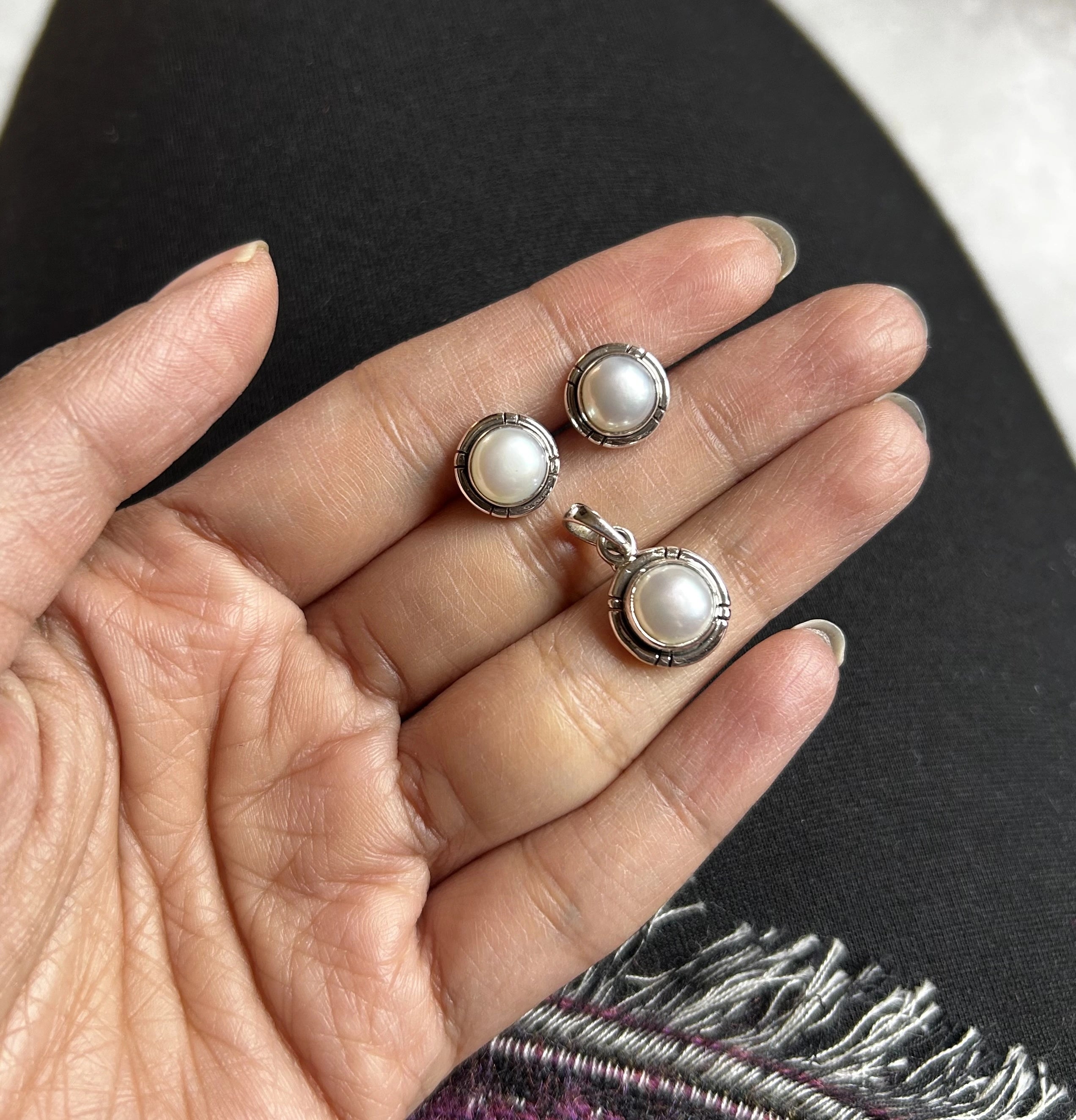Elegant 1.1cm pearl pendant along with matching 9mm studs in pure 925 silver