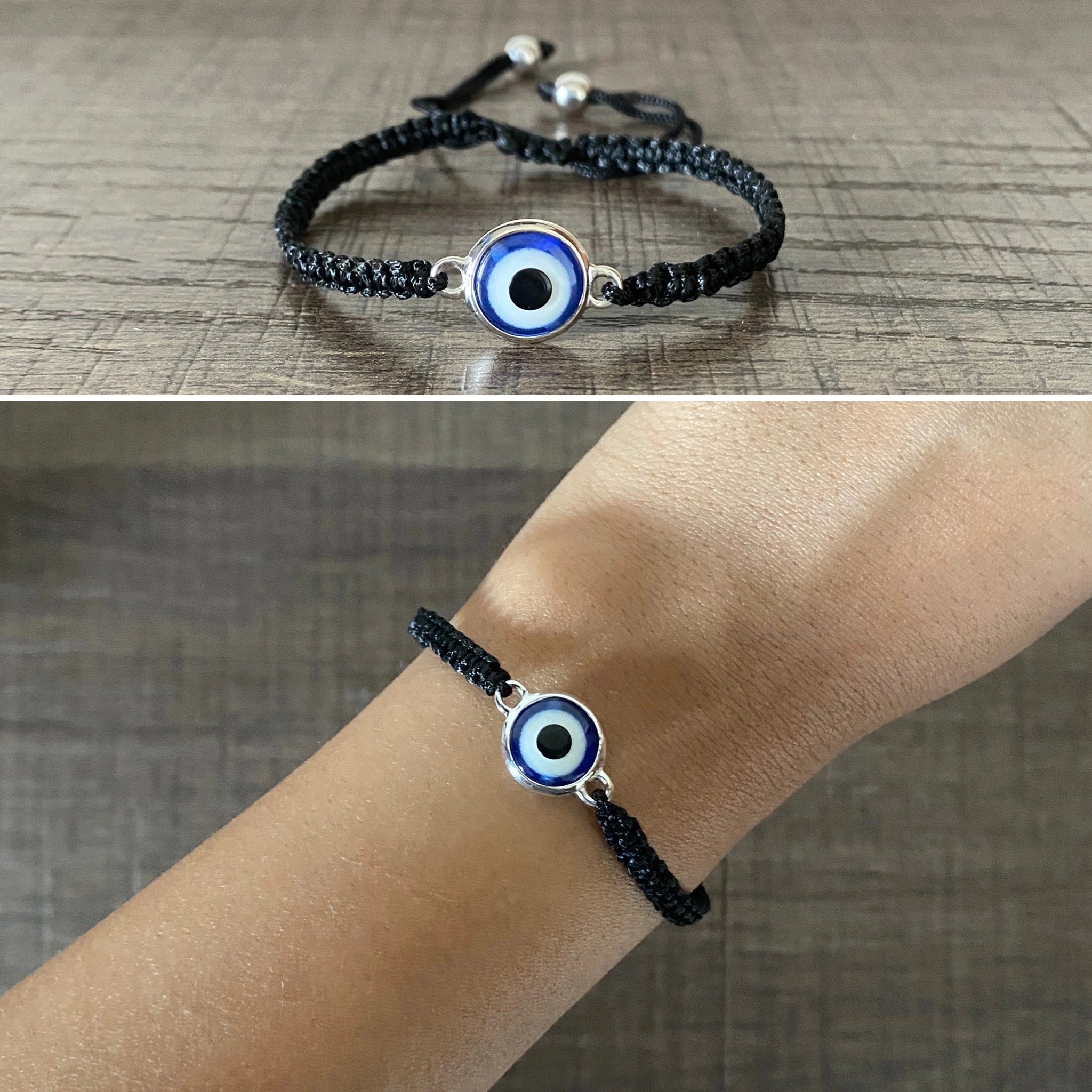 Our 1.2 cm diameter adjustable evil eye bead bracelet with a pure (925) silver ring. It is made using a hand braided black waxed cotton colourfast thread.