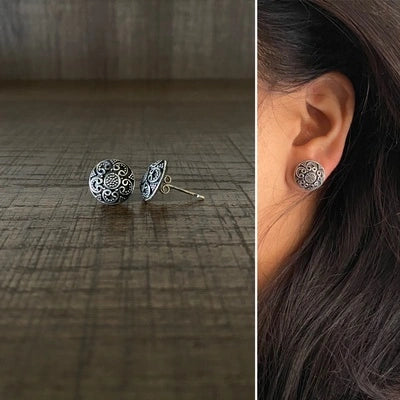 1.4 cm diameter carving rava work studs with antique finish in pure 925 silver