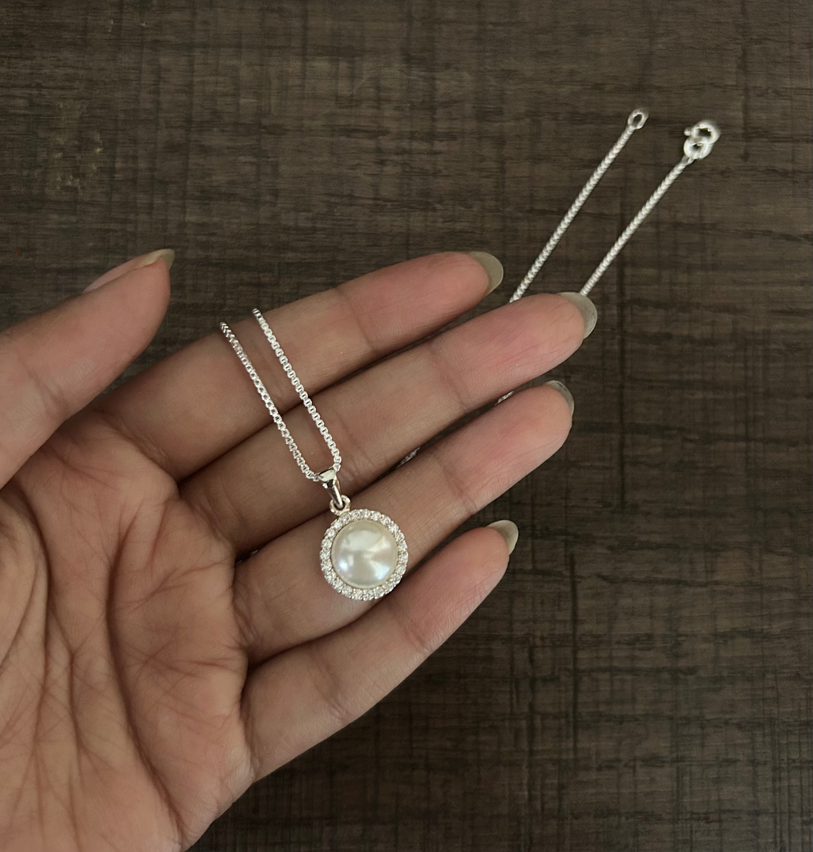 Gorgeous 1.4cm diameter fresh water pearl pendant with a multiple cz stone border and an 18’’ chain in pure 925 silver
