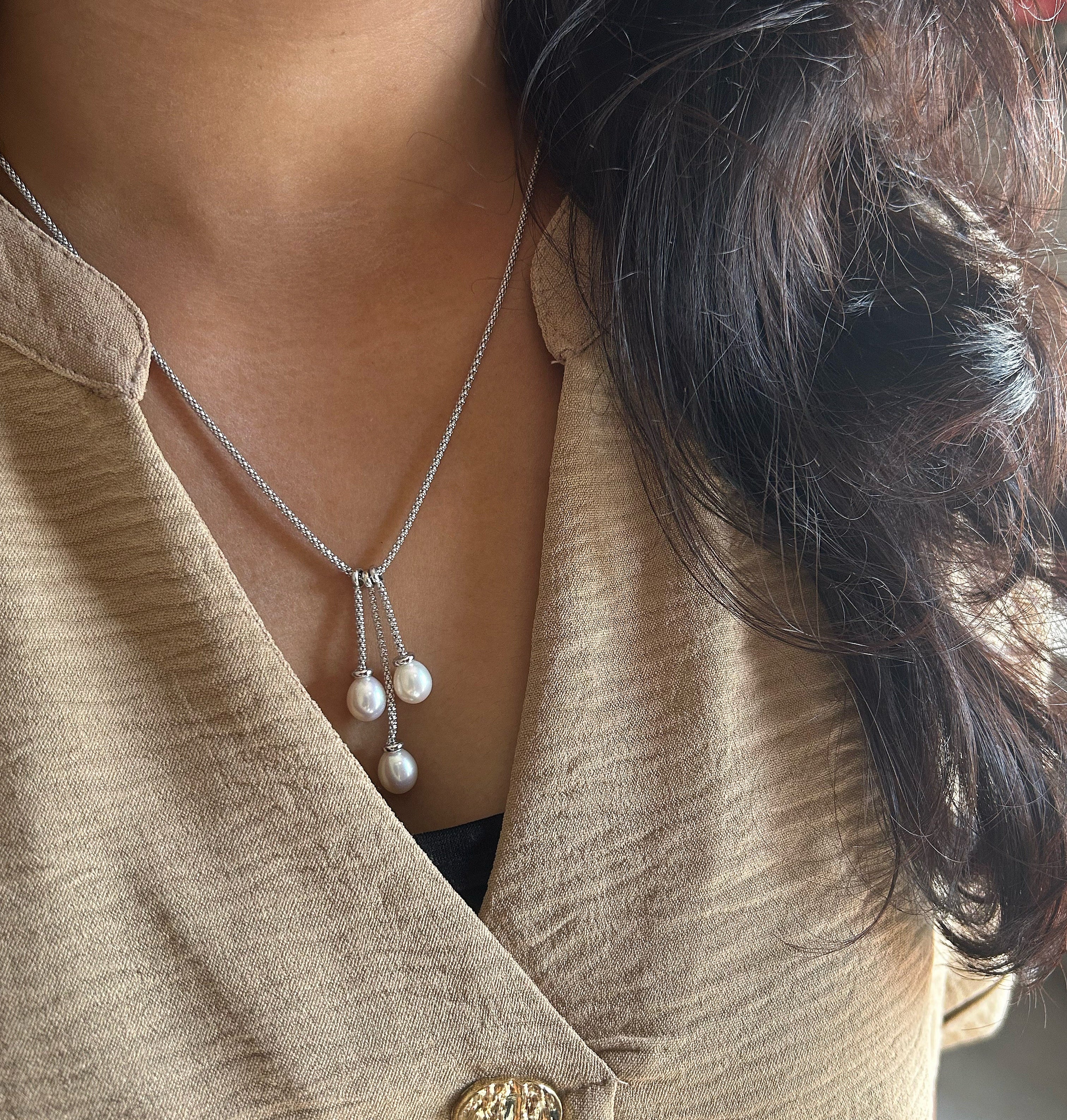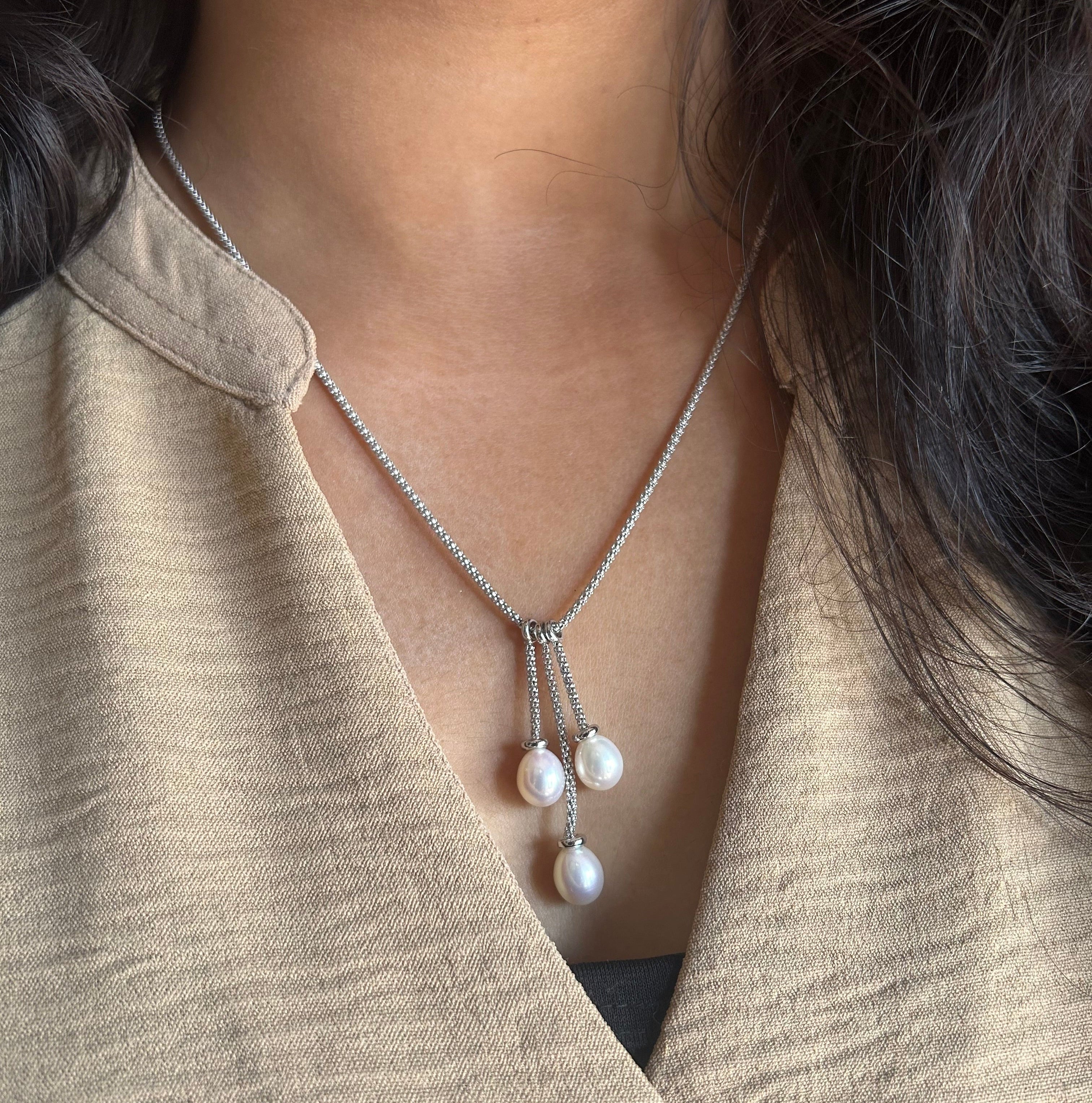 A Pearl-fect beauty! Our 18ich long three pearl hanging chain in pure 925 silver is a unqiue statement piece