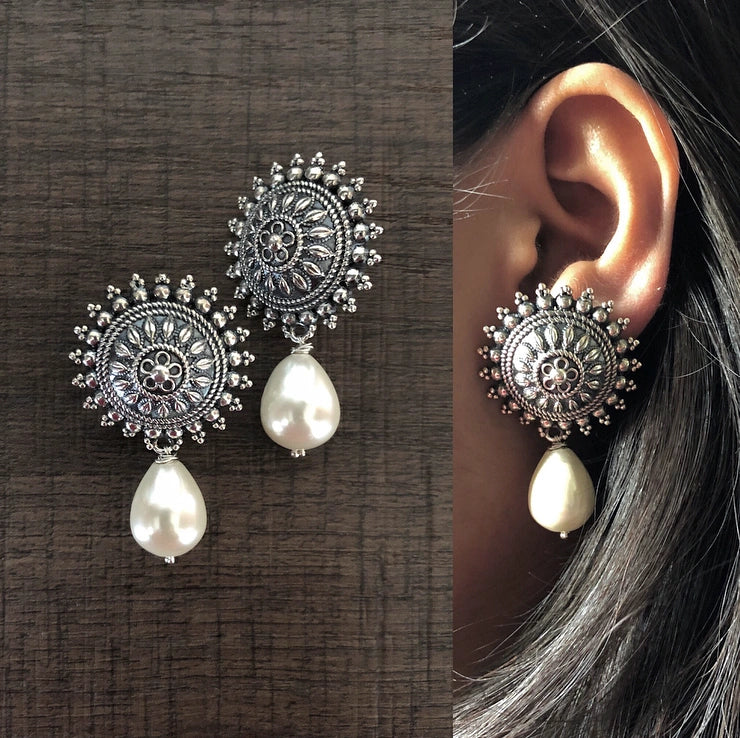 2.8 cm diameter royal rava and carving work studs with fresh water pearl drops in pure 925 silver