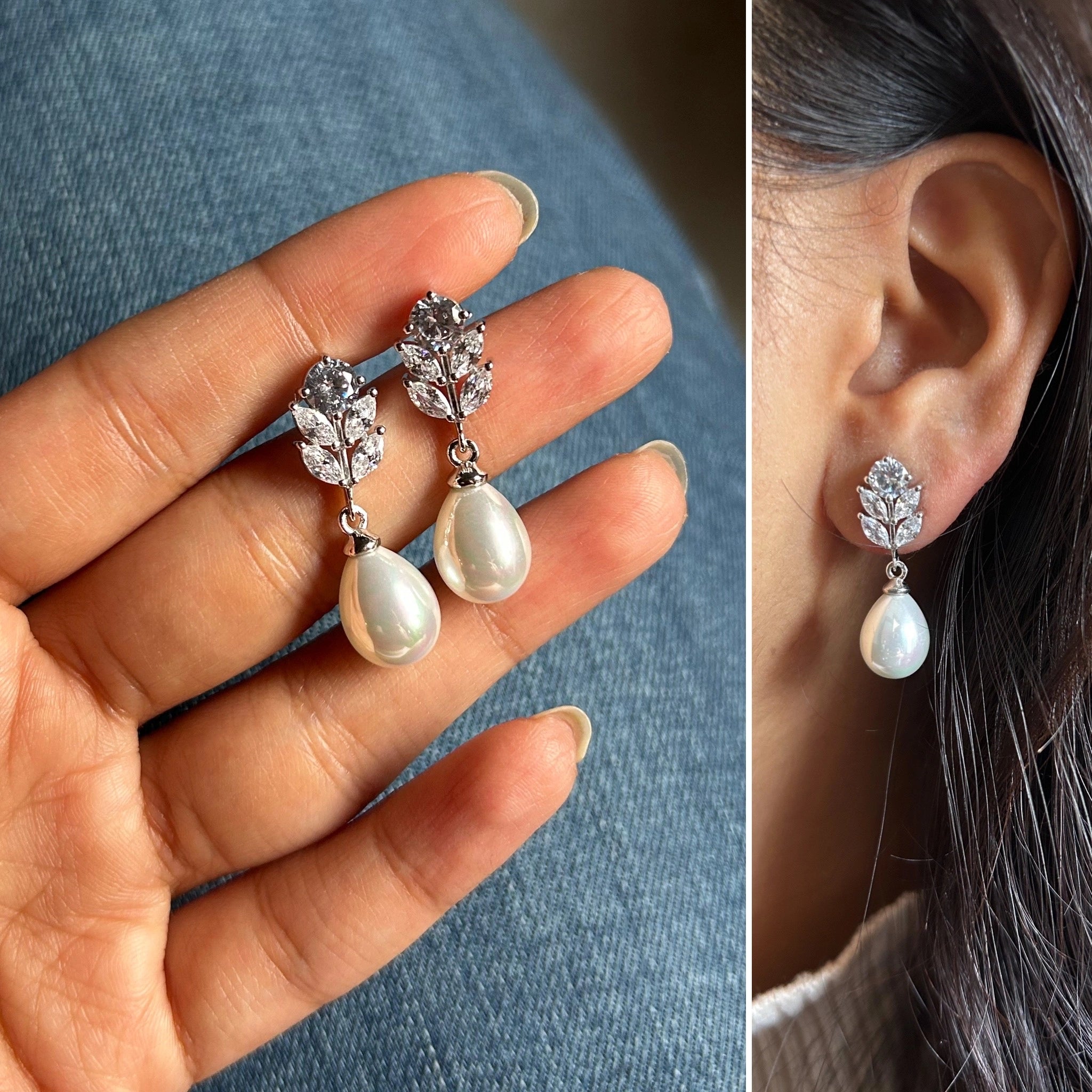 3cm long marquise cut cz stone studs with shell pearl hangings crafted in pure 925 silver