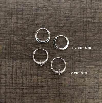 Our small 1.2 cm diameter plain flat balis along with 1.2 cm diameter wire work balis in pure (925) silver. These can be worn in the upper piercings and by kids as well !