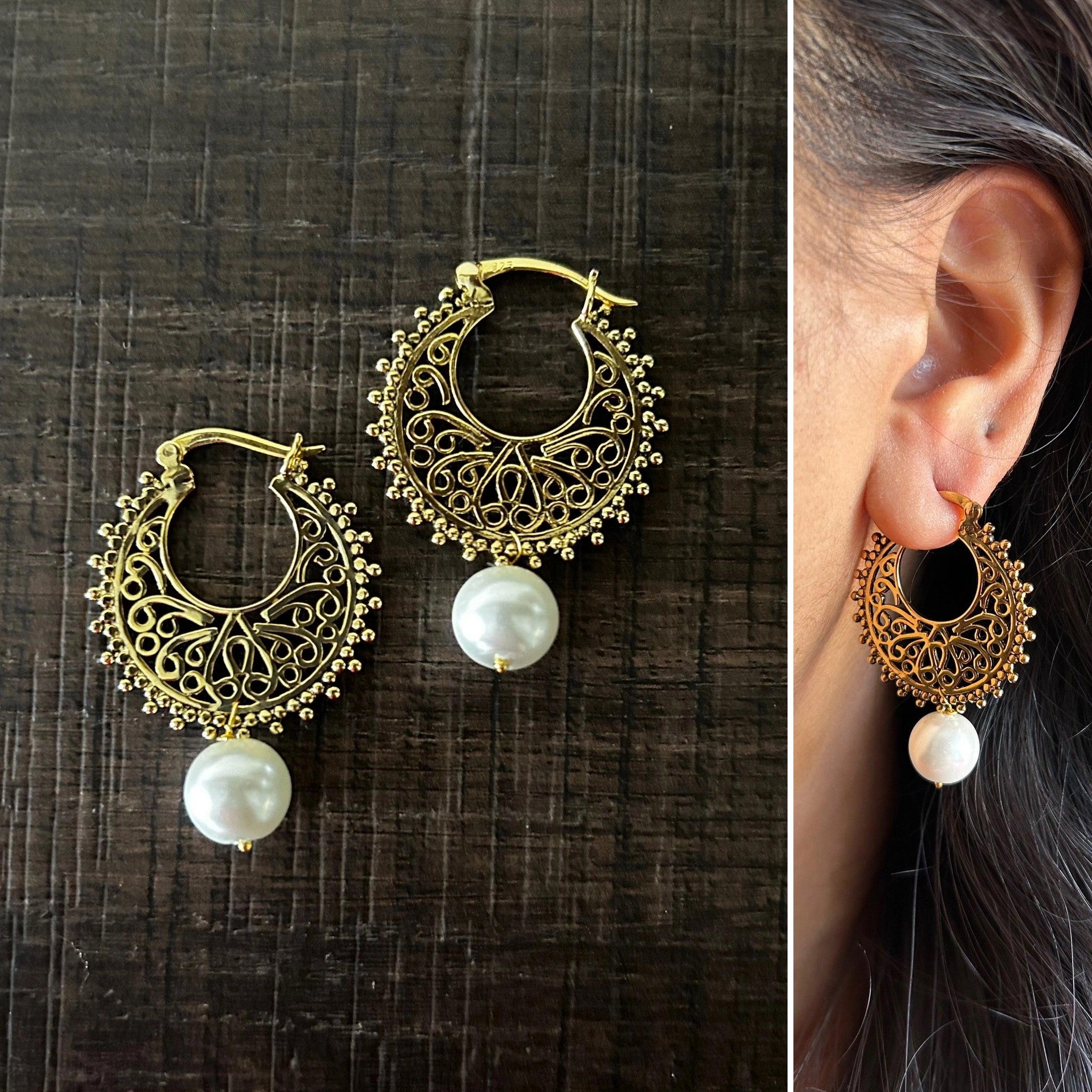 Filigree cut work balis with single round pearl drops in pure silver with 22kt gold plating