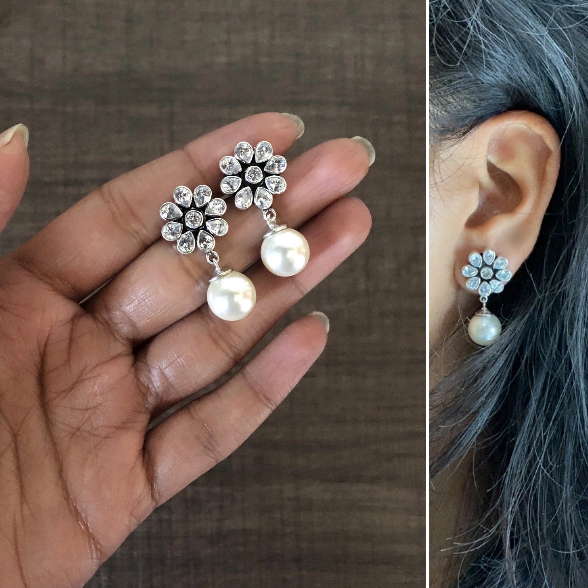 Stunning flower bezel setting cz stone studs with processed pearl drops crafted in pure (925) silver