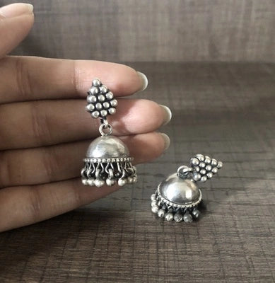Grape cluster pattern stud with antique hammered texture jhumkas in pure 925 silver