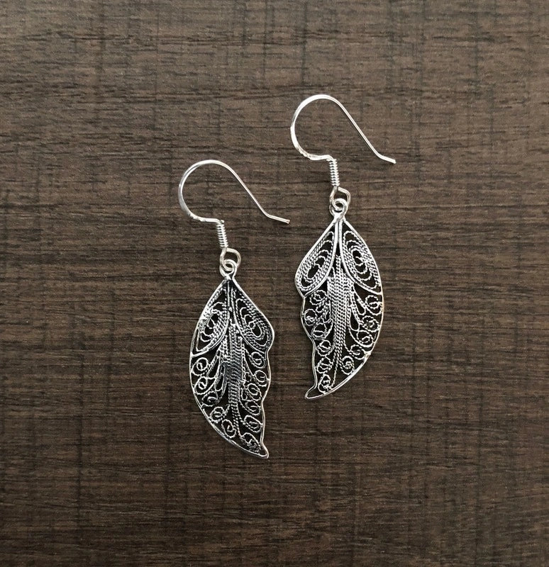 Trendy pure (925) silver leaf pattern earrings with an intricate filigree work