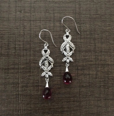 Multi cz stone studded danglers with dark pink drops in pure 925 silver