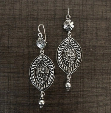 Unique and long, Oxidized finish floral carving work earrings in pure 925 silver