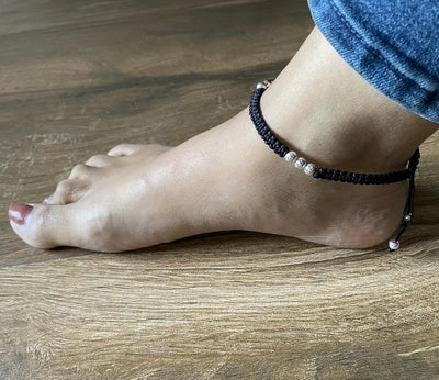 Plain nine beads adjustable anklet made in pure 925 silver with a waxed cotton black thread