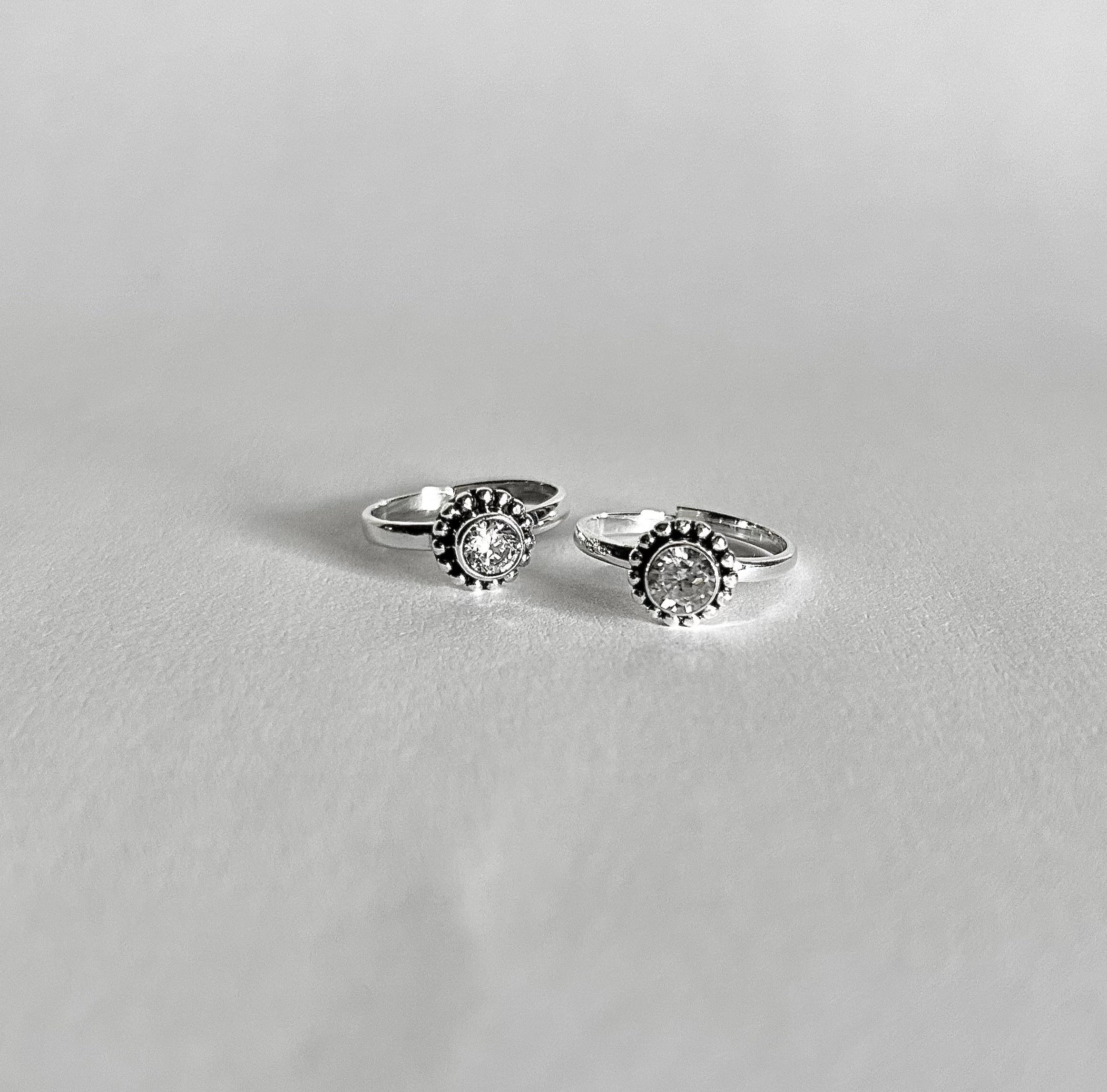 Sparkling single cz with rava border toe ring in pure silver (one pair)