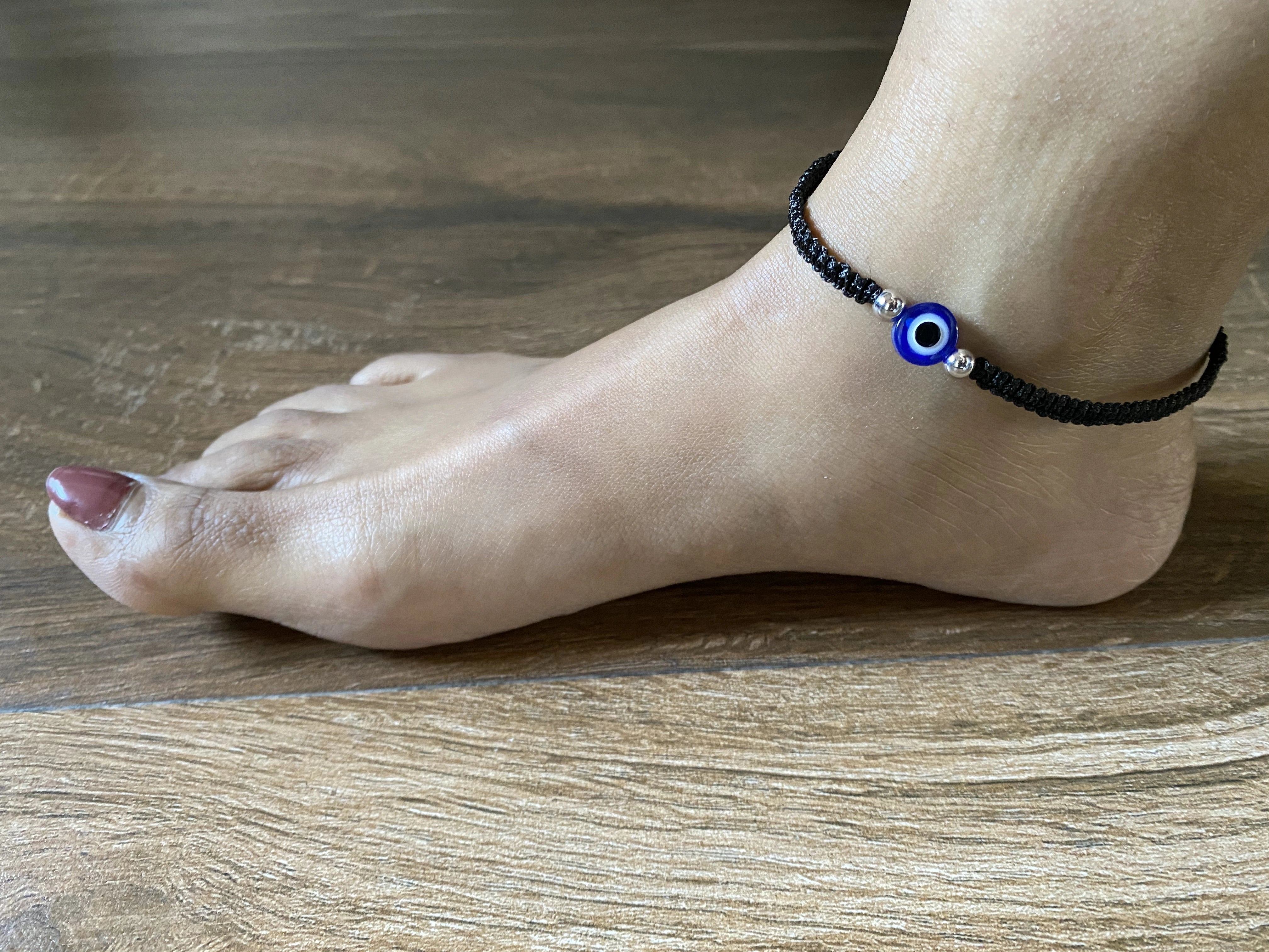 Single evil eye bead and silver beads black thread adjustable anklet in pure (925) silver. Made using a fine quality black waxed cotton thread.