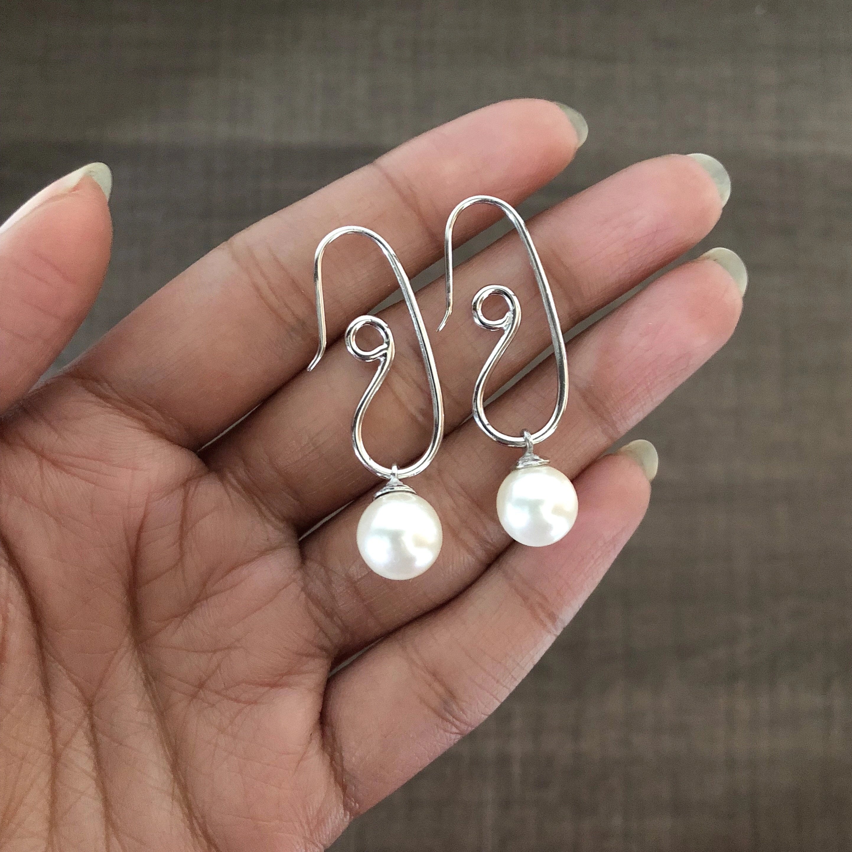 Super trendy pure (925) silver spiral earrings with round processed pearl drops