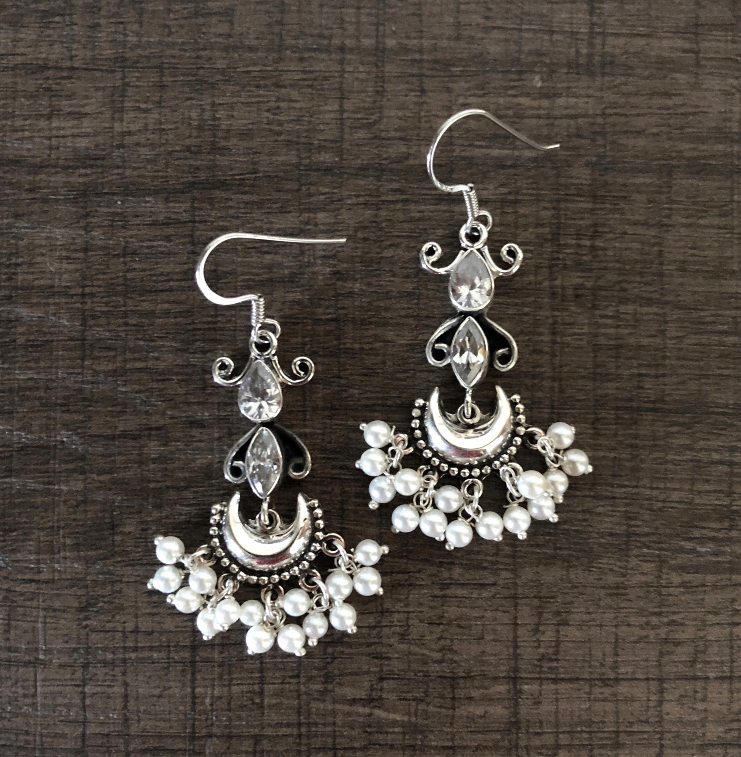 Traditional cz cut stone chandbali style pearl cluster hangings in pure 925 silver